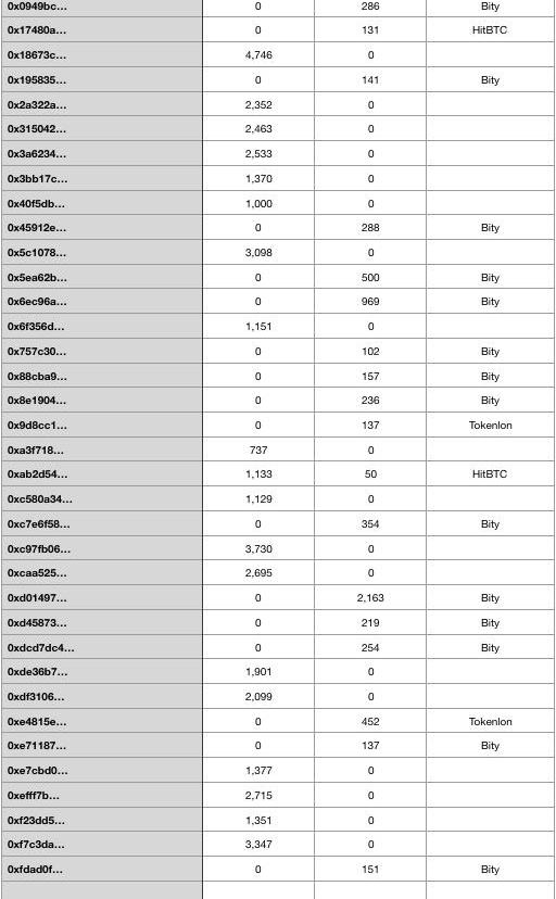 在完成資金分散轉移后,詐騙分子找合適機會前后將6,311個ETH洗入了交易所,其中流入Bity交易所5,958個ETH、HitBTC181個ETH、Tokenlon589個ETH。