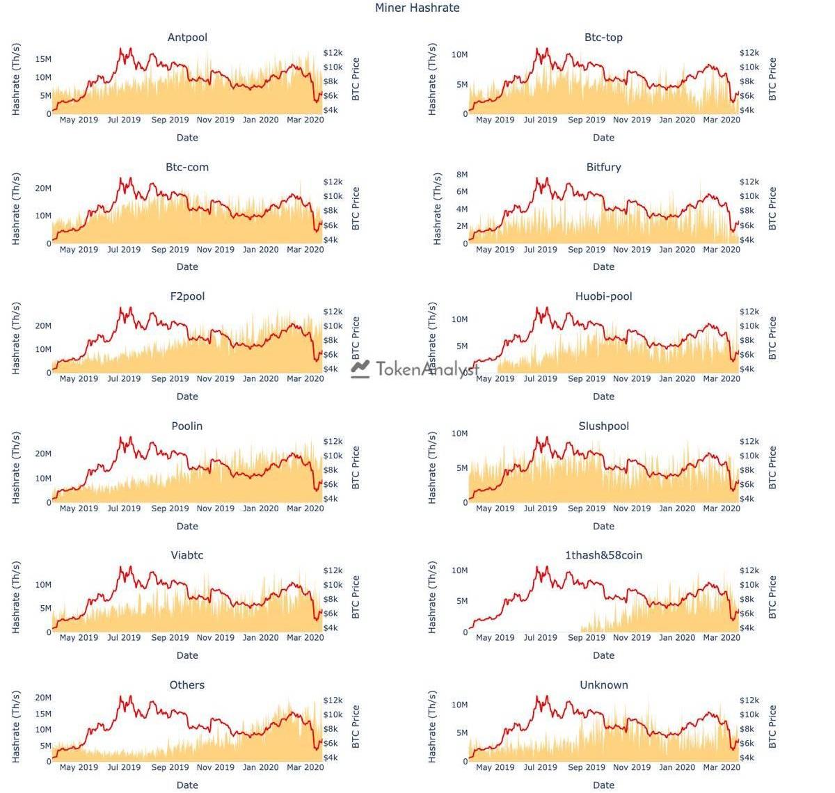 新冠肺炎疫情在全球范圍內爆發,全球市場也受到了巨大沖擊,全球股市、原油、黃金都一度出現跳水,比特幣也在3月12日和3月13日兩天出現大暴跌,24小時跌幅甚至達到50%。比特幣價格下跌,直接打穿各類礦機的關機價,有報道稱,很多礦工很可能會臨時性地套現。在歷史上,由礦工主導的比特幣拋售就曾發生過。