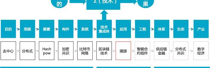 例如,在區塊鏈發展過程中,從“去中心化”的目的、分布式思想、多種技術的整合和集成到比特幣網絡是自由生長的過程,從區塊鏈技術、提供溯源應用到組件化的工程實現是標準化的過程,從支撐供應鏈體系、建立分布式共識的生態到服務于數字經濟產業是產業化過程。整個發展歷程都在利用技術完成從目的到結果期望。