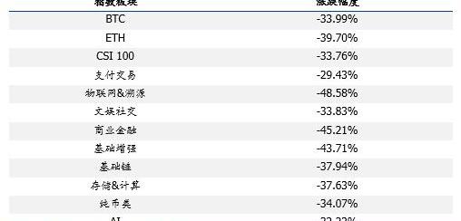 從細分板塊來看,支付交易、AI優于ChainextCSI100平均水平,分別為-29.43%、-32.22%;物聯網&溯源、文娛社交、商業金融、基礎增強、基礎鏈、存儲&計算、純幣類表現均遜于ChainextCSI100平均水平,分別為-48.58%、-33.83%、-45.21%、-43.71%、-37.94%、-37.63%、-34.07%。