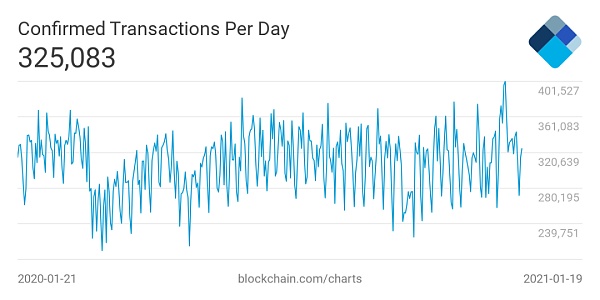 然而,你需要在圖表中尋找一段時間才能找到這個歷史高位。比如,假設你區塊鏈上看日交易數量。在這種情況下,你可能會產生幻覺:401,000個日交易數,1月7日出現的一個小高峰,但這個數值離之前的記錄還有相當大的距離,比如在2019年5月2日,有超過450,000個交易。