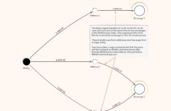 圖5顯示,如果我們研究這五個轉賬地址,其中三個最大規模的轉賬地址幾乎是同時發送到兩個交易所的,這兩個交易所均是BitMEX的價格指數的組成部分。它們很可能是由一個實體控制,這表明此市場事件是精心策劃的。