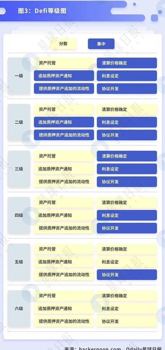 以傳統金融為例,平臺采取第三方托管仍是集中式的,當發生違約風險時,銀行強制清算,資產價值由銀行決定,借貸利息也由銀行規定。而這些要素在不同項目中表現出不同的去中心化程度。據此,DeFi可被劃分等級。
