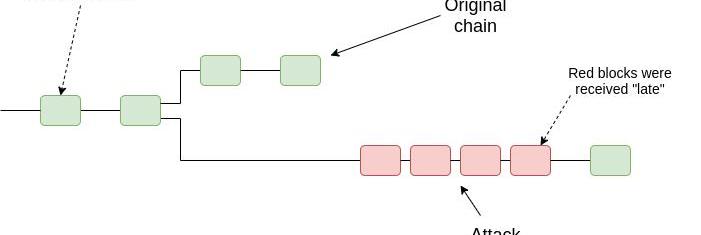 及時性檢測器最基本的結構如下。對于客戶端收到的每個數據塊,客戶端都會維護一個“是否是及時”的依據,它會說明客戶端是否認為區塊是“準時”收到的。其目的是在51%攻擊中嘗試區分攻擊鏈和“正確”鏈: