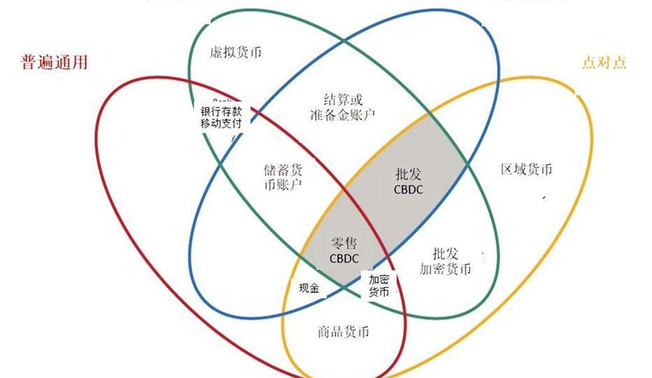 Bech等人運用維恩圖繪制的貨幣之花,用四個橢圓來劃分貨幣的四個關鍵屬性:貨幣的發行人,貨幣的形態,貨幣的通用性,貨幣的轉移。展示了不同的貨幣類型之間的邏輯關系,并提出了央行數字貨幣的主要屬性。上圖中黃色框代表點對點支付,藍色框代表央行發行,綠色框代表電子形態,紅色代替普遍通用性。按維恩圖法則,兩個區域相交集表示它們有公共元素,零售型CBDC是圖1中唯一具有4種主要屬性的貨幣類型:央行發行,電子形態,普遍通用和點對點支付。批發式CBDC不具有普遍通用性,因為這種CBDC只用于銀行間結算轉賬。