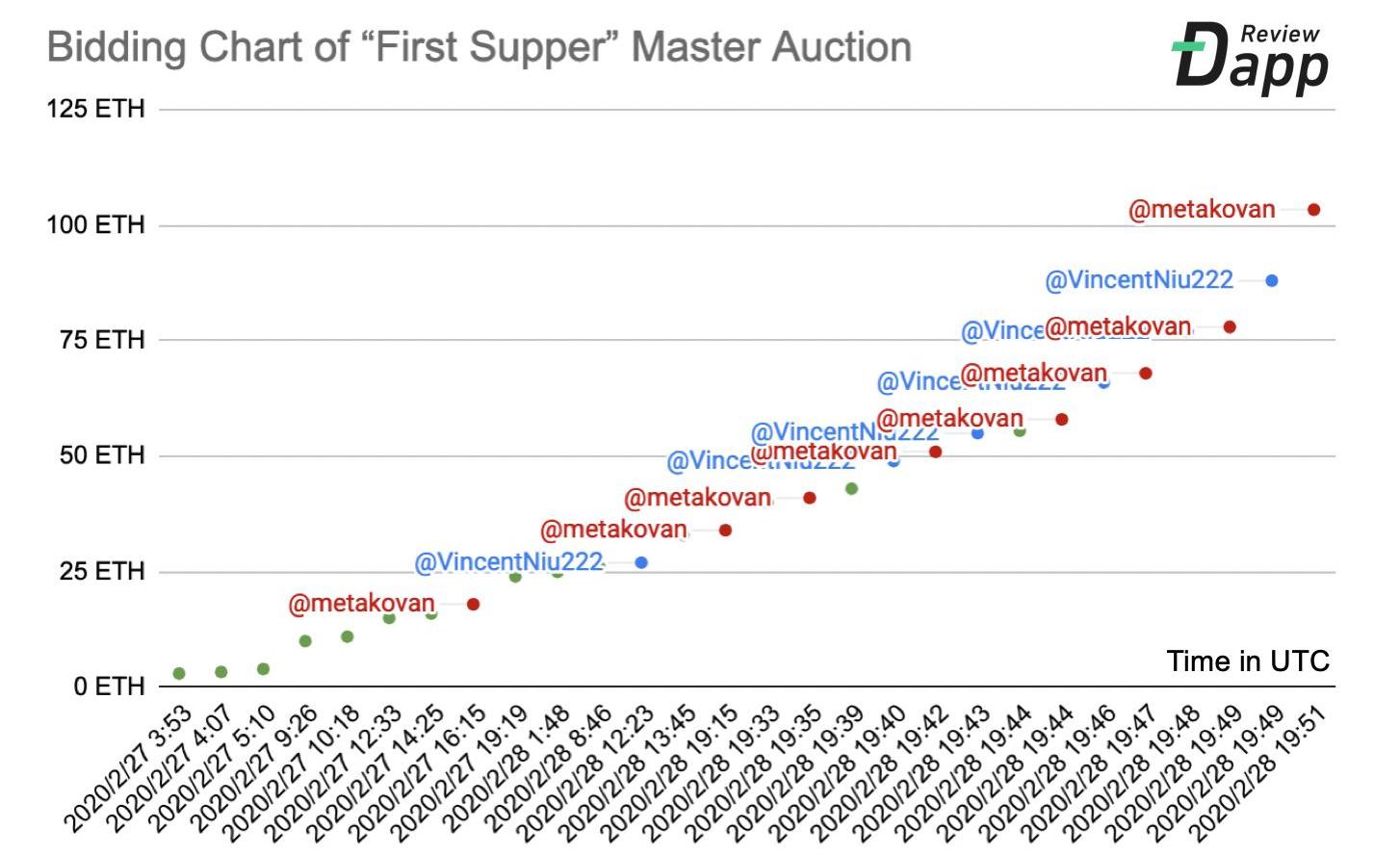 FirstSupper拍賣開始于UTC時間2月27日凌晨,28號晚上結束,最后階段,每有一位競拍者出價,倒計時自動延長五分鐘。在幾位競拍者將價格提至55.55ETH之后,只剩下Vincent和MetaKovan兩位競拍者繼續出價,價格迅速來到了Vincent出價的88ETH。MetaKovan人狠話不多,直接加碼到103.4ETH,此后Vincent再未出價,MetaKovan了結了這場漫長的拉鋸戰,贏得了此次競拍。MetaKovan后來在Discord群里說,他當時特意去看了Vincent錢包,發現只有99ETH,考慮自己的幸運數字是34,所以干脆直接出價到103.4ETH的價格。最終該作品以103.4ETH被MetaKovan拍中。