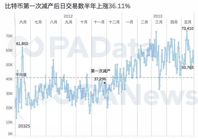 比特幣今年的日均交易次數平均約為31.14萬次,與去年平均水平接近》。今年日均交易次數已上漲了44.18%,目前的漲幅已經高于前兩次減半前。