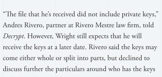 CraigWright的律師、RiveroMestre律師事務所的合伙人AndresRivero告訴加密貨幣媒體Decrypt:“他收到的文件不包含私鑰。”但是,Wright仍然希望他以后能收到私鑰。Rivero說,私鑰可能是以完整的形式或也分開的形式收到,但其拒絕進一步討論誰擁有鑰匙以及何時收到的細節。