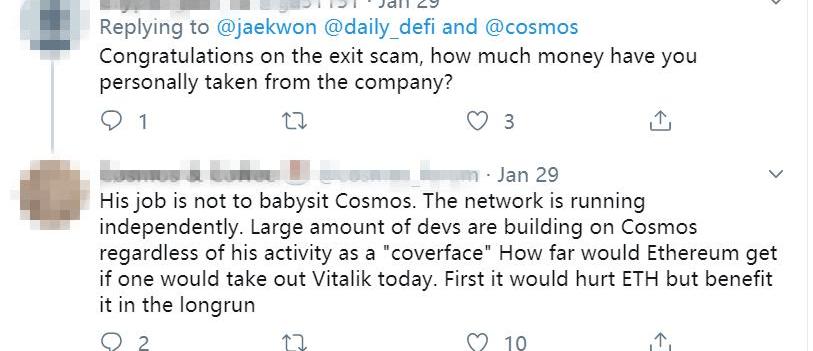 不看好的人說:「你從這個公司獲利了多少?」也有人為其辯護:「他的工作不是照顧Cosmos,這個網絡是獨立的……如果Vitalik離開,肯定會傷害ETH,但長遠來看,這反而是有益的。」