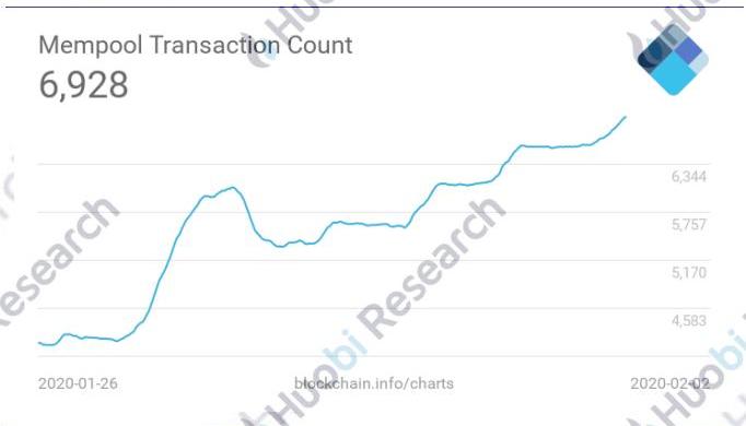 本周比特幣平均未確認交易數上漲66.74%。截止2020年2月2日,比特幣7天平均未確認交易數為6928,環比上漲66.74%。