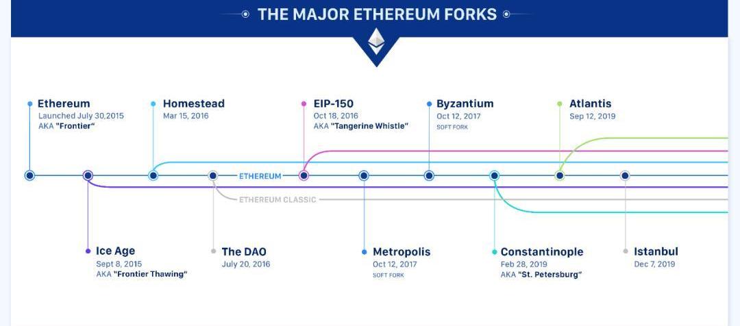 快速且穩定的迭代始終是技術進化的終極武器。以太坊秉承「快速迭代」的工程思想,從項目設計之初,就確定將按照計劃推進不斷升級協議,以確保安全性、可用性、功能性和去中心化的最優配置。以太坊的突出技術創新包括智能合約技術、分片技術、Plasma和RollUp擴容技術和Layer2解決方案等前沿技術,網絡初始版本為奧林匹克,共分為四個升級階段,前沿、家園、大都會和寧靜,其中前三個階段為ETH1.0,最后階段:寧靜為ETH2.0。其中,ETH2.0是指將通過一系列技術升級實現以太坊從POW共識機制向POS共識機制過渡,其核心技術為分片技術,將大幅度提升整個分布式系統的處理能力。以太坊主要的歷史升級事件如下所示: