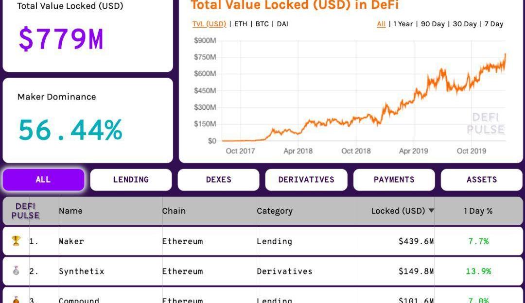 值得注意的是,DeFi正在在以太坊網絡中蓬勃發展。根據情報追蹤網站Defipulse的數據顯示,以太坊中的鎖定資產價值已經創下歷史新高,達到779M美元,其中MakerDAO的鎖定資產占比超過56%。MakerDAO是一個借貸平臺,同時提供了一種通過多資產抵押而產生穩定幣DAI的一種途徑。此外,DeFi不僅能夠大幅度提升ETH的鎖倉率,也提供了一種打通傳統金融市場的待選通道,將可能在未來大幅度加速整個加密資產行業與傳統金融的結合。