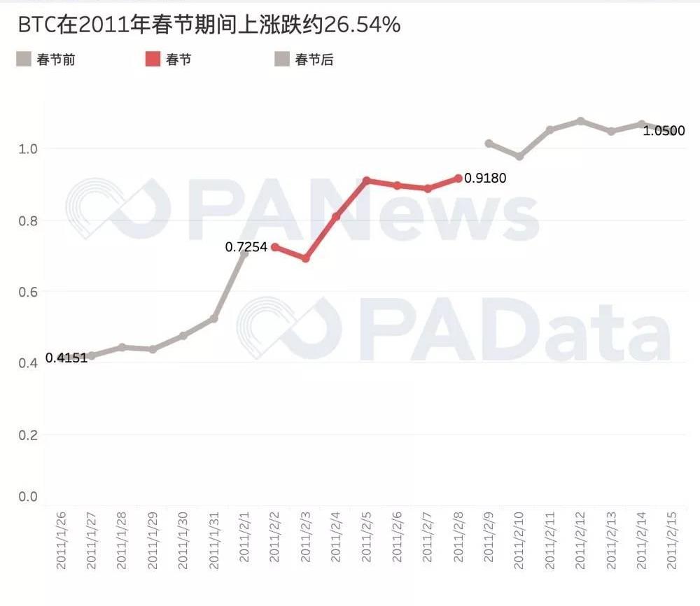 2011年,比特幣剛誕生不到三年,彼時比特幣的幣價剛剛突破1美元。春節期間,比特幣的幣價從約0.73美元漲至0.92美元,7天漲幅達到了26.54%