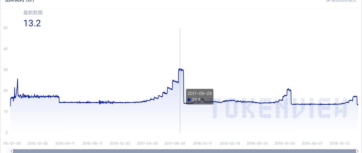 為了使爆塊時間趨于穩定,以太坊存在一個不斷增加挖礦難度的難度炸彈。由于以太坊難度炸彈提供的值每10萬個區塊增加一次,永不下降,且呈現指數性增長,因此到一定時間點,難度炸彈會迅速增加網絡難度,使出塊速度驟減。該現象于2017年5月份開始顯現,當年9月22日至10月15日期間,以太坊的出塊耗時都在30秒左右,達到了平均耗時的一倍,該現象持續了長達24天,在2017年9月29日,以太坊出塊耗時達到了史上最高的30.5秒,當日產生區塊僅有2829個。為解決這一問題,2017年10月16日,以太坊進行了拜占庭分叉,創建新的規則,進而提升了整個系統,拜占庭分叉令挖礦難度顯著性降低,這使以太坊平臺的交易速度明顯提高,但挖礦獎勵也從5個ETH降低到了3個。