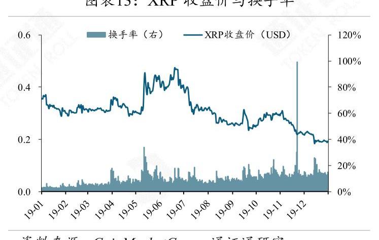 XRP現價0.194美元,周漲幅為1.3%,月跌幅為10.6%。本周XRP日均成交量為11.6億美元,日均換手率13.8%。XRP走勢較BTC稍強,但略遜于ETH和EOS。