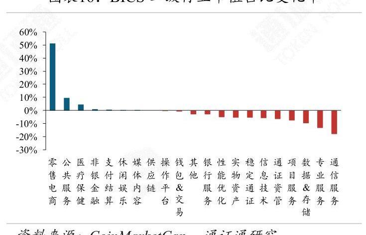 本周通證數量增長較為明顯的BICS二級行業為非銀金融與醫療保健,下降較為明顯的為通信服務。