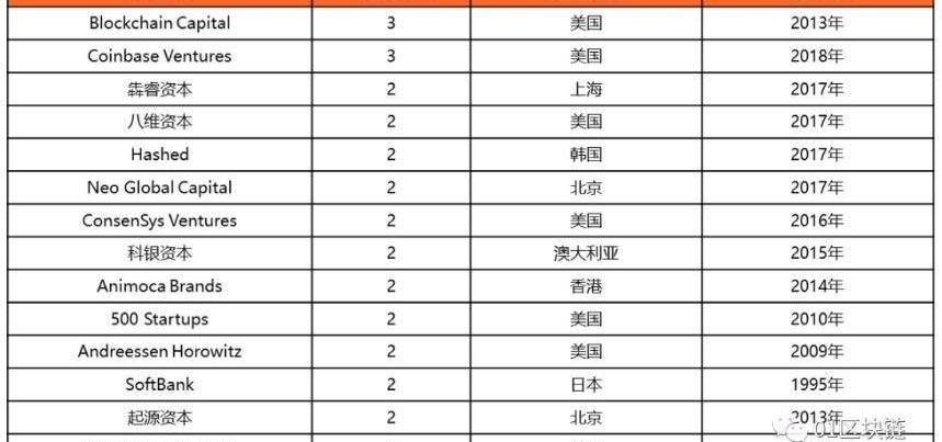 14家機構中,有9家為專注于區塊鏈領域的新興投資機構,且絕大多數都成立于2017年或以后。有5家傳統投資機構分別為500Startups、AndreessenHorowitz、SoftBank、起源資本和WinklevossCapital。