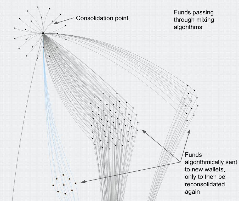 其中許多交易是通過諸如?WasabiWallet?這種混合器操作的,該混合器利用CoinJoin協議讓資金路徑追蹤變得更加困難。下面是一個ChainalysisReactor分析圖,你可以從中了解一個追蹤示例: