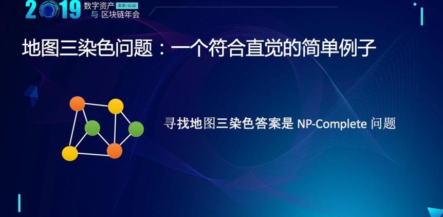 零知識證明背后的原理是我今天要講的重點,希望能讓大家快速地理解。這是一個尋找地圖三染色答案的問題,我們把一個地圖想象成一個個城市,然后把城市用線連起來,相鄰的城市必須用不同的顏色來染色。那么相當于我們要求一個圖上的每一條邊的兩端頂點顏色必須不同。尋找地圖三染色答案是一個NP-Complete的問題,也就是一個NP難解問題。
