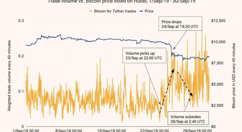 而交易量方面,正如我們預期的那樣,從9月23日開始,就在PlusToken錢包向HuobiOTC經紀人發送了大量比特幣之后的幾天,我們看到關于Tether的比特幣交易量有所增加。9月24日之后不久,比特幣的價格開始下跌。