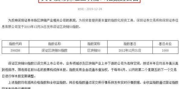 12月24日,深交所發布兩市首個區塊鏈指數——“區塊鏈50指數”。深交所表示,發布指數是為反映深圳證券市場區塊鏈產業相關公司的表現,為投資者提供更豐富的指數化投資工具。