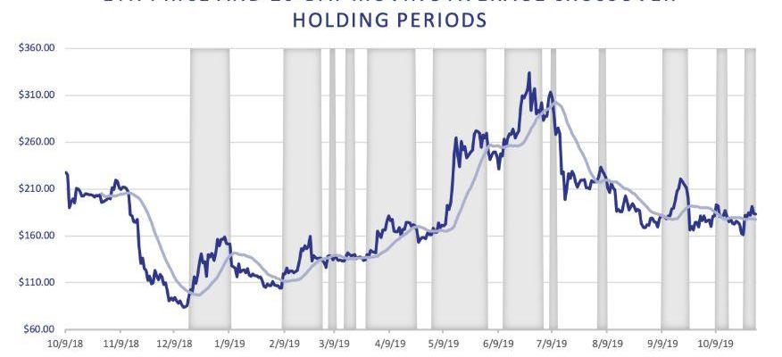 ETH和比特幣的價格一直保持著高度相關性,他們的表現在很大程度上是具有可比擬性的。但是在2019年7月,以太坊出現了持續下跌,而比特幣的價格卻有所恢復。不過,當時間來到2019年9月,比特幣價格也跟著出現大幅跳水的態勢。在我們評估的這段時間,兩個資產的峰值價格都比各自的起始價格有200%的增長。和峰值價格相比,ETH現在已下跌約50%,而比特幣則下跌了約34%。在評估期間的結束時點,以太坊買入并持有策略實現了69.3%的回報,而比特幣買入并持有策略則實現了131.4%的回報。