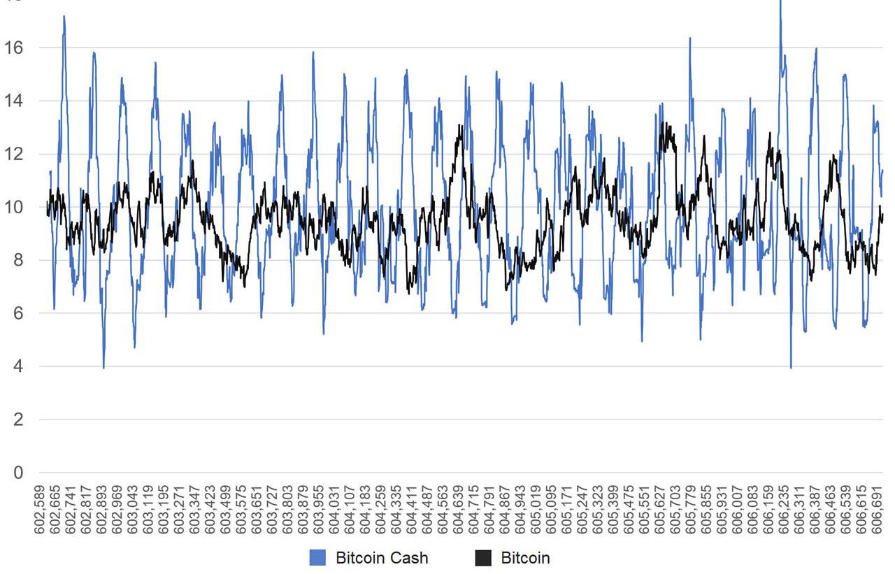 不僅是區塊之間的比特幣現金時間間隔看起來比比特幣更加不穩定,峰值更高而谷值更低,而且其隨機性似乎也更小,峰值和谷值更規律。數據可能存在某種形式的周期性,這可能意味著操縱,但我們沒有發現任何直接的證據。另一方面,數據的隨機性意味著圖表可能看起來有周期性,但這可能是錯覺。請注意,比特幣現金難度是按照每個區塊調整的,因此調整算法不應造成此類周期性。還請注意,選擇的是50個區塊的滾動周期,以最大程度地增大峰值和谷值的大小,因此圖表可能對問題略有放大。
