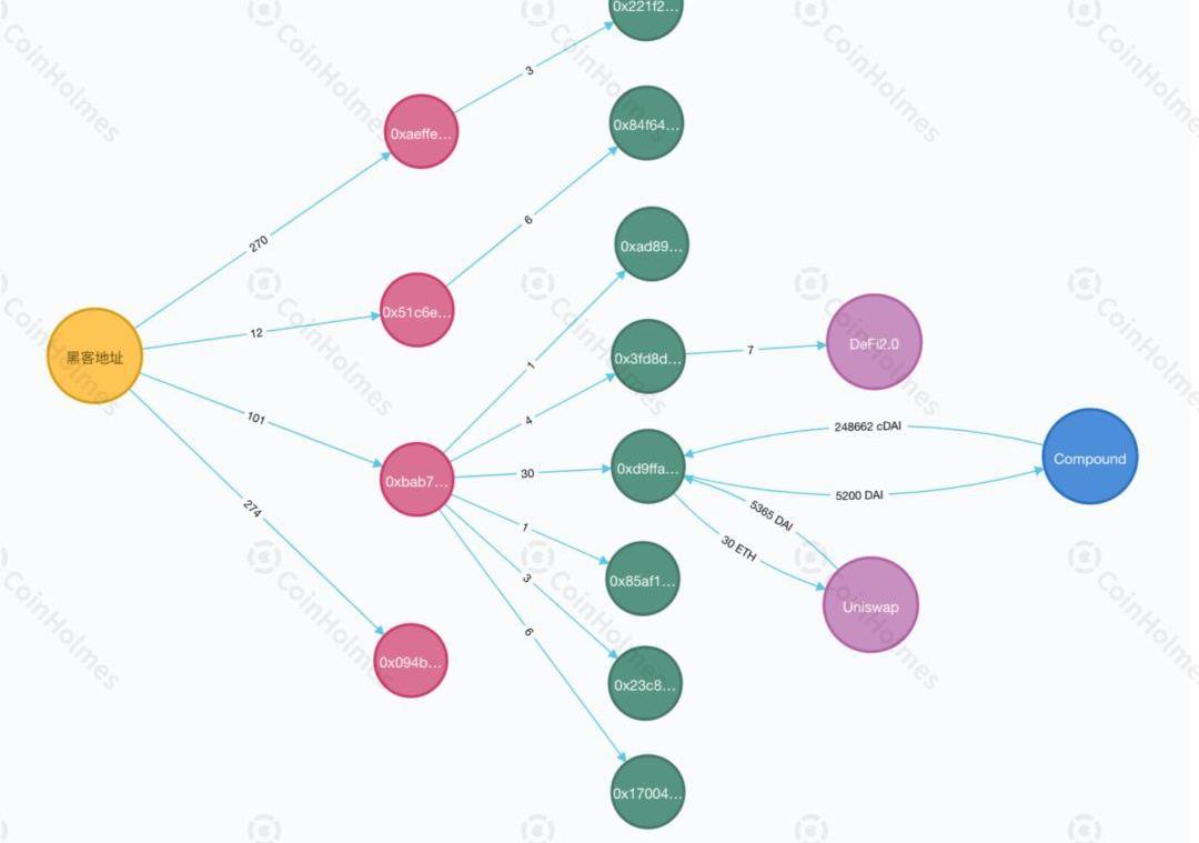其中CoinHolmes監測到Cryptopia部分被盜資產流入了Uniswap去中心化交易所和知名DeFi項目Compound。資產流向示意圖如下: