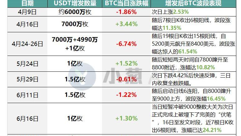 如上表所示,雖然BTC在USDT進行增發第一時間的漲跌表現并不存在明顯規律,但是在增發落地后的一段時間里,幾乎都出現了超10%的波段上漲,其中4月底一波集中巨額增發落地的第一時間BTC雖然出現了比較明顯的價格回調,但是隨后很快進入到了“原地起飛”的節奏之中,價格在幾乎沒有任何回調的情況下暴漲3000美元,直接完成了從5000到8000的飛躍。