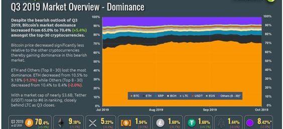 在排名前30位的加密貨幣中,比特幣的市場支配力從65.0%增至70.4%。穩定幣在第三季度也看到了其市場主導地位和市值排名上升。雖然ETH和XRP依然保持在第二和第三的位置,但所占市場份額有一定的下降。