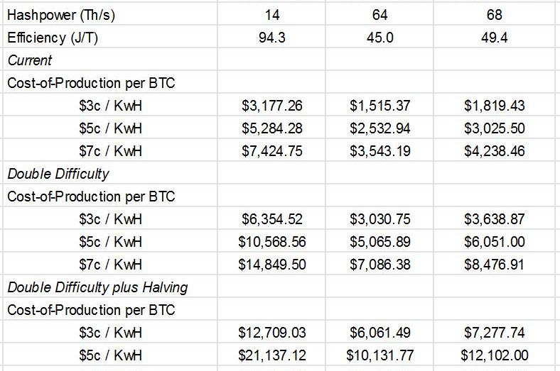 利用最新礦機的參數,預測算力增長,電價上漲,獎勵減半,可以預測生產成本;使用上面提到的數字作為輸入值,我們可以有把握地說,比特幣的生產成本將大幅上升。