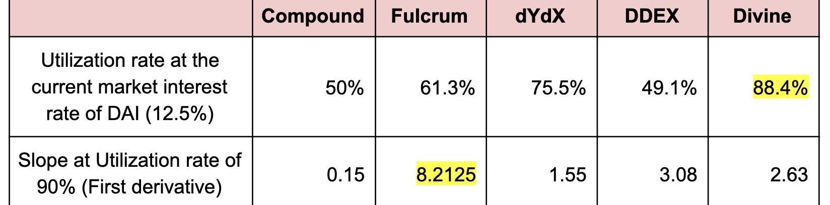 作者通過對比不同的Defi借貸服務產品及其DAI貸款利率模型的深入分析:Fulcrum和Compound;dydx和ddex;Divine。以下是分析結果: