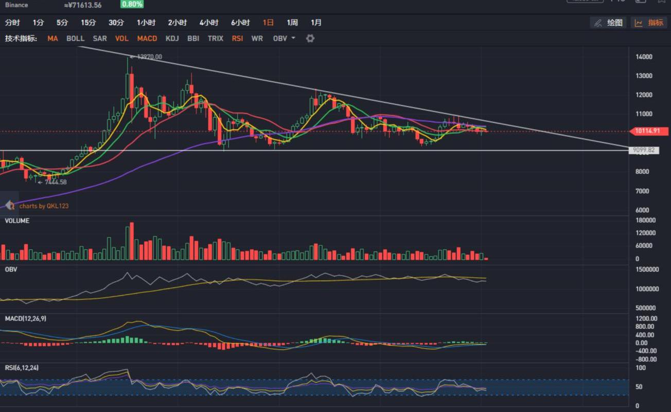 短時來看,昨日BTC向下插針9880美元后有所上行,目前在10100美元附近小幅震蕩,多空膠著。短期來看,近日沿著收斂三角上沿趨于向下收斂,但下行空間有限,近期有望企穩上行。