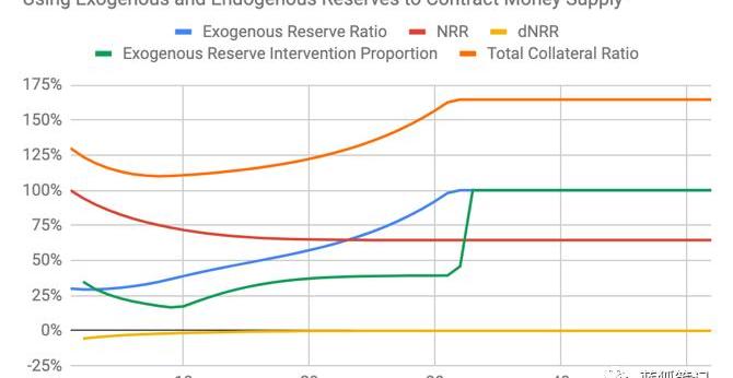 總而言之,如果dNRR為負,那么就賣出外生準備金。NRR下降幅度越大,更多的外生準備金將被賣出來補貼其內生準備金的穩定能力。盡管有很多場景和特殊情況無法單獨用一個簡單的公式來描述,但這是了一個解決復雜問題的有效框架。如果穩定幣經濟重新轉向擴張,那么將使用上一節中所說的算法,可以用一定的速度來自動重新平衡準備金。