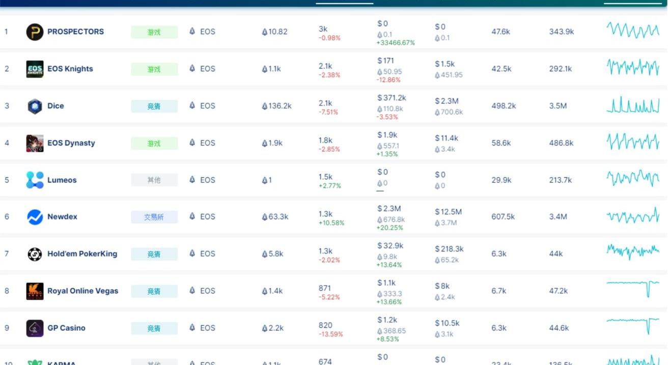 據DappRadar統計數據,24小時EOSDApp整體活躍程度略有降低。其中,游戲PROSPECTORS的24小時用戶數3k,較昨日變化-0.98%;競猜應用Dice的24小時活躍用戶數2.1k,較昨日變化-7.51%;數據應用Lumeos的24小時活躍用戶數1.5k,較昨日變化+2.77%;交易應用Newdex的24小時活躍用戶數1.3k,較昨日變化+10.58%。
