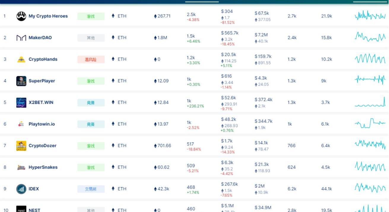 觀察DappRadar統計數據,24小時ETHDApp整體活躍程度略有增加。其中,游戲應用MyCryptoHeroes的24小時活躍用戶數2.5k,24小時變化-4.38%;金融應用MakerDAO的24小時活躍用戶數1.5k,24小時變化+6.46%;交易應用IDEX的24小時活躍用戶數468,24小時變化+1.74%。