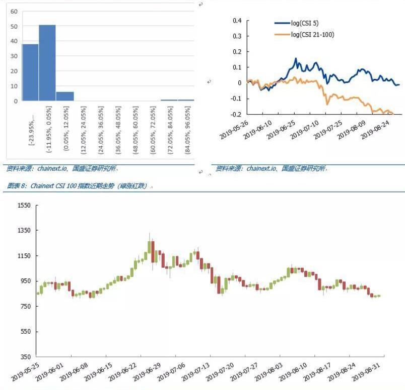 我們引入代幣市場的專業指數產品——ChainextCSI系列指數,其中CSI100指數代表市場整體走勢;CSI5指數代表市場超大盤幣種走勢;CSI21-100指數代表市場中小盤走勢。本周市場持續調整。截至上周日,ChainextCSI100指數為833.39,環比上周下降6.7%,周日24小時總成交量為74.43億美元;這其中,BTC全球均價為9757.97美元,環比前期下降4.61%;ETH全球均價為171.63美元,環比前期下降9.18%。