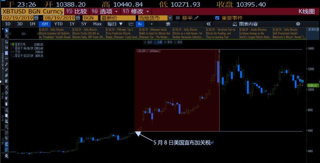 可以看到的是,自2019年5月美國宣布開始加收關稅后,美股面臨壓力,而比特幣逐價格逐步走高,從6000多美元至今差不多翻了一倍,最高時高達14000美金左右。顯然,對于投資者們來說,比特幣已經成為更為安全的”避風港”。