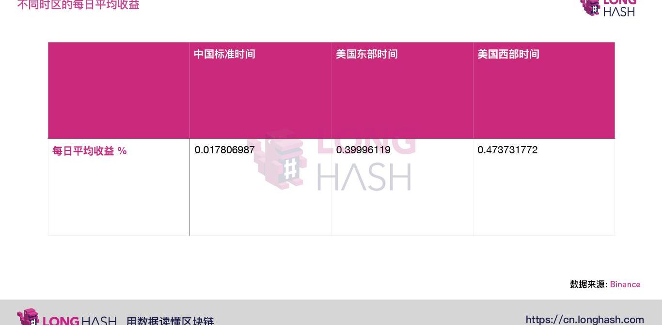 事實上,當我們考慮不同時區的每日收益率均值時,我們會發現大體上來說,比特幣在亞洲交易時段內幾乎沒有任何價格漲幅,幾乎所有的上漲行情都發生在美國交易時段。