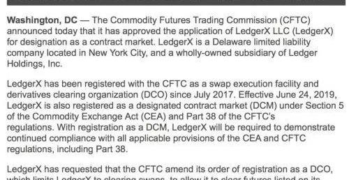 而LedgerX作為已受監管的合規期貨合約交易所和清算所,早在2017年7月就已經在CFTC注冊了掉期執行設施許可資質和DCO認證,LedgerX此前已經具備了為客戶提供掉期合約和期權合約的資質。而在2018年11月LedgerX又向CFTC提出的合約市場DCM申請,已于今年的6月24日取得了DCM的許可資質。而背靠美國最大網絡券商之一TDAmeritrade的ErisX交易所則是在2011年11月獲得了DCM許可證,并于上月初獲得了DCO許可證。