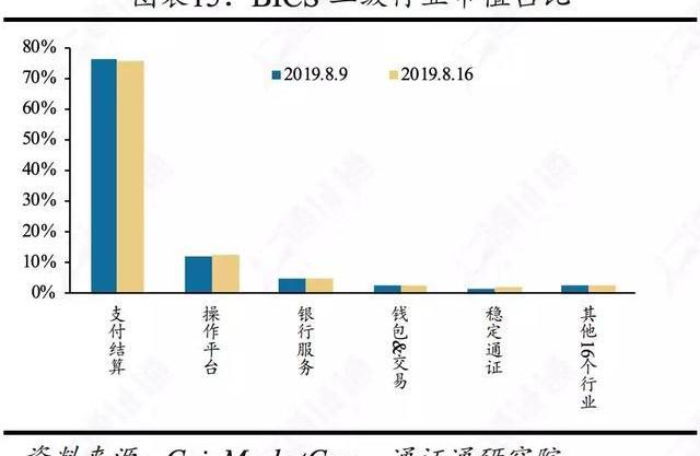 行情:反彈遇阻,回踩支撐。本周數字通證總市值為2707.4億美元,相比上周下降344.2億美元,跌幅為11.3%。日均成交量為568.7億美元,較上周下降4.0%,日均換手率為20.2%。BTC現價10374.3美元,周跌幅為12.5%;日均成交量為182億美元。ETH現價185.4美元,周跌幅為11.9%;日均成交量為67.8億美元。本周交易所BTC余額為88.6萬個,較上周增加4870個;ETH余額為919.3萬個,較上周增加1萬個。BICS二級行業中,支付結算市值與通證數量有所下降。