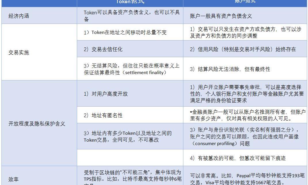 金融基礎設施分為賬戶范式和Token范式,前者以銀行賬戶體系為代表,后者以區塊鏈為代表。這兩個范式有很大差異,但都可以用來承載金融資產和交易,在很多應用場景中呈現了非常復雜的替代和互補關系。
