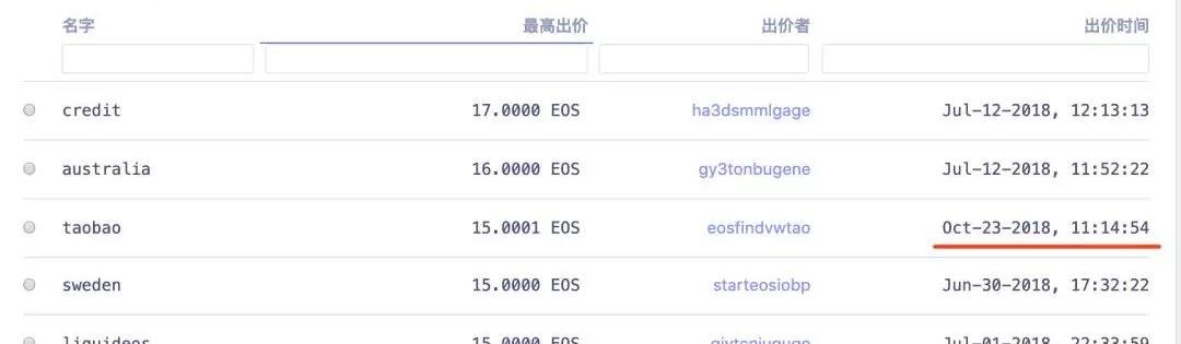 例如,6位數的EOS短賬號taobao,在2018年12月23日就產生了最高競拍價格15.0001EOS,但為什么這么久一直沒有競拍成功?就是因為EOS短賬號15.0001EOS的競拍價格,要和全網所有競拍EOS賬號的出價相比,由于一直有其它短賬號的競拍價高于15.0001EOS,所以,短賬號taobao一直沒有成交。