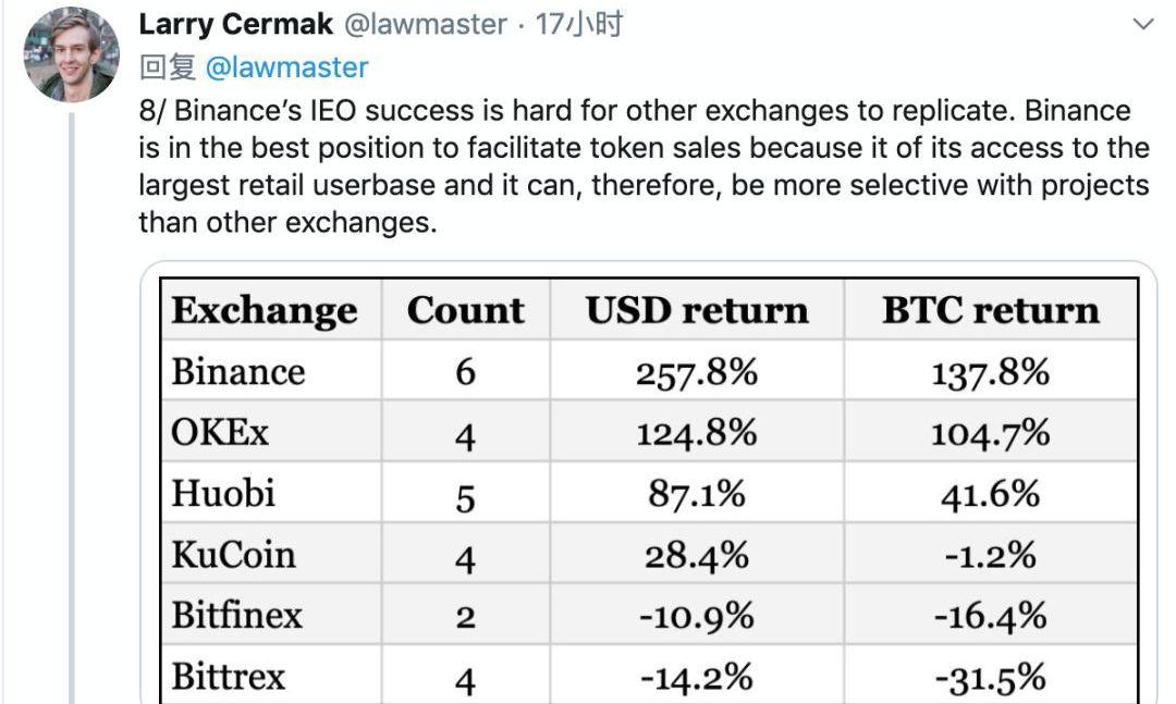 9、2019年IEO的平均回報:幣安258%;Okex125%;火幣87%;Kucoin28%;Bitfinex-11%;Bittrex-14%。