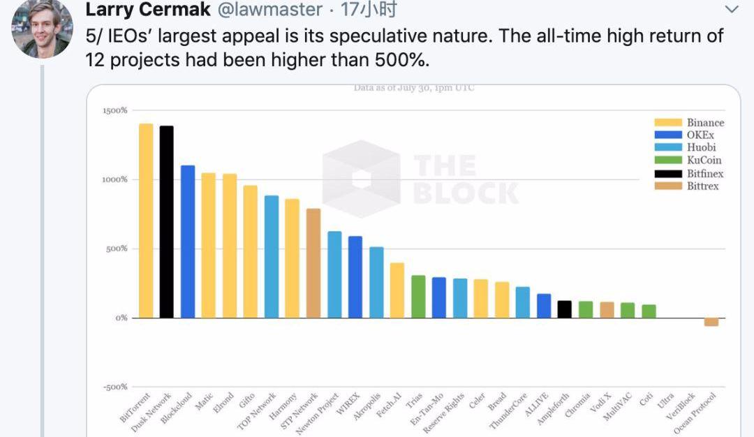 5、IEO最大的吸引力是它的投機屬性。12個項目中最高的回報超過了500%。