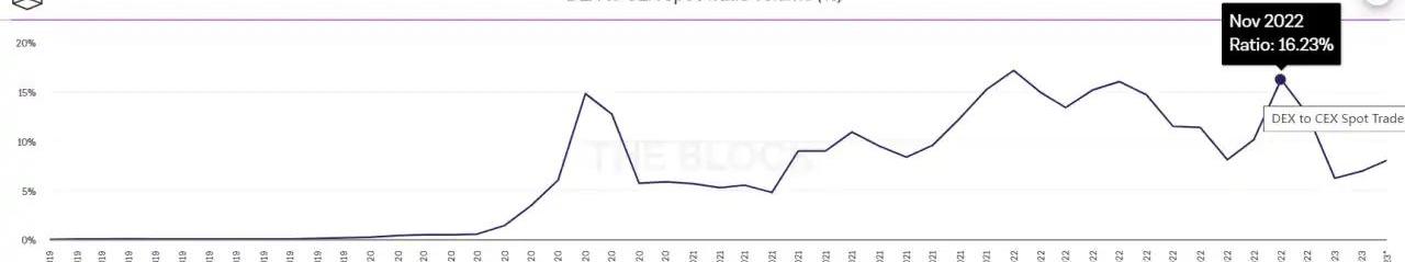 Monthlydecentralizedexchangevolumedividedbycentralizedexchangevolume(asapercentage)?includeslargestexchangeswithtrustworthyreportingofexchangevolumemetrics.「Source:https://www.theblock.co/data/decentralized-finance/dex-non-custodial/dex-to-cex-spot-trade-volume」DEX和Swap在以太坊上發展迅速。在過去的一年里,交易量占CEX的比例一直在這個范圍內波動:從低位8%到高位約16%。然而,比特幣作為最大的加密資產確實被排除在外,投資者/投機者只能在Swaps/DEXs中交易wrapped比特幣,這并不令人滿意。