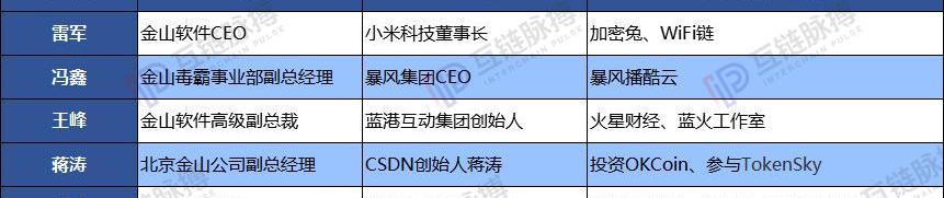 馮鑫、王峰是金山系的舊部,此外金山系的著名人物還有雷軍、蔣濤、傅盛等,值得注意的是,在過去兩三年,他們都進入了區塊鏈領域。