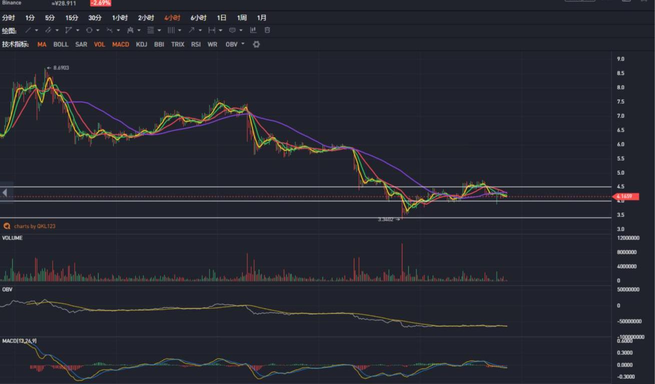 EOS小幅震蕩,延續魚尾行情,方向主要聯動BTC為主。目前,EOS/BTC交易對在0.00043附近震蕩,短時獲得支撐。