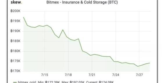 國外數據分析平臺skew的數據則反映出,似乎在彭博社報道之前,市場中就有用戶和機構聽到了風聲并采取了行動。因為從7月13日開始,BitMEX冷錢包中的BTC就開始減少,到7月26日,原來的19.5萬枚BTC已經變為17.3,數據變動背后的原因可能是BitMEX在此期間收到了大量的提款請求。