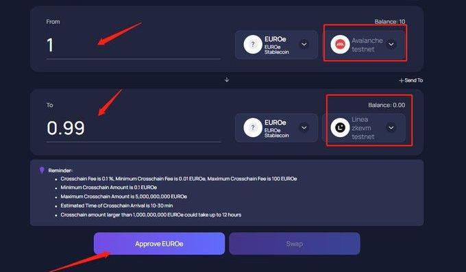 8.使用Multichain橋將EUROEe從AvalancheFuji跨到Linea1)領取測試代幣EUROEe和AVAXhttps://faucet.avax.network2)打開Multichain橋https://test.multichain.org/#/router3)輸入EUROEe金額,從AvalancheFuji跨到Linea